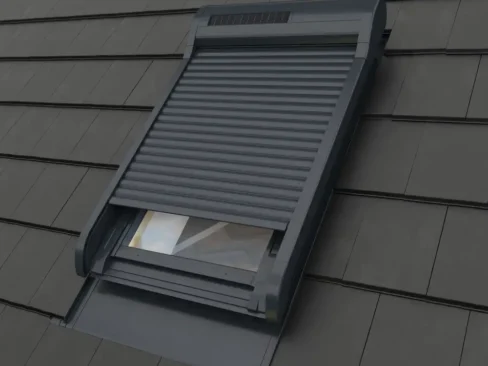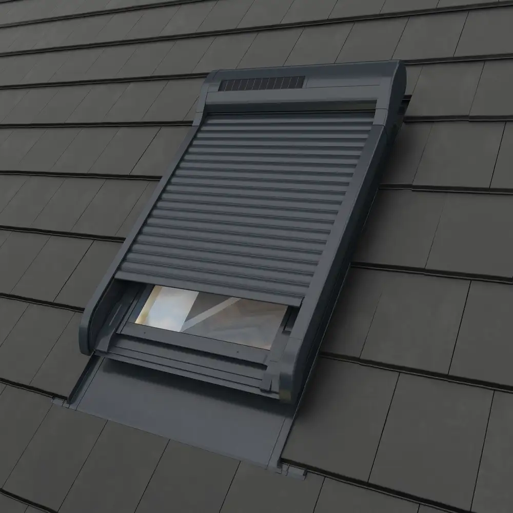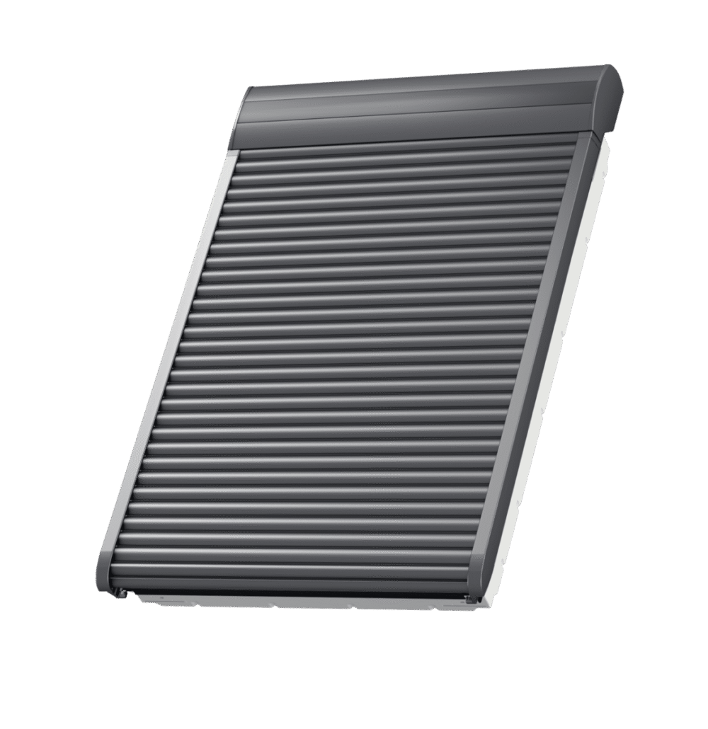 - Aluminiowa roleta zewnętrzna VELUX – zapewnia doskonałe zaciemnienie i izolację termiczną.